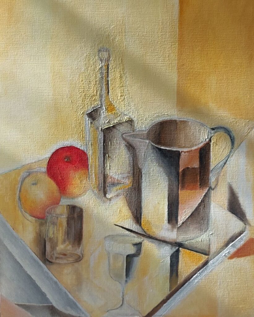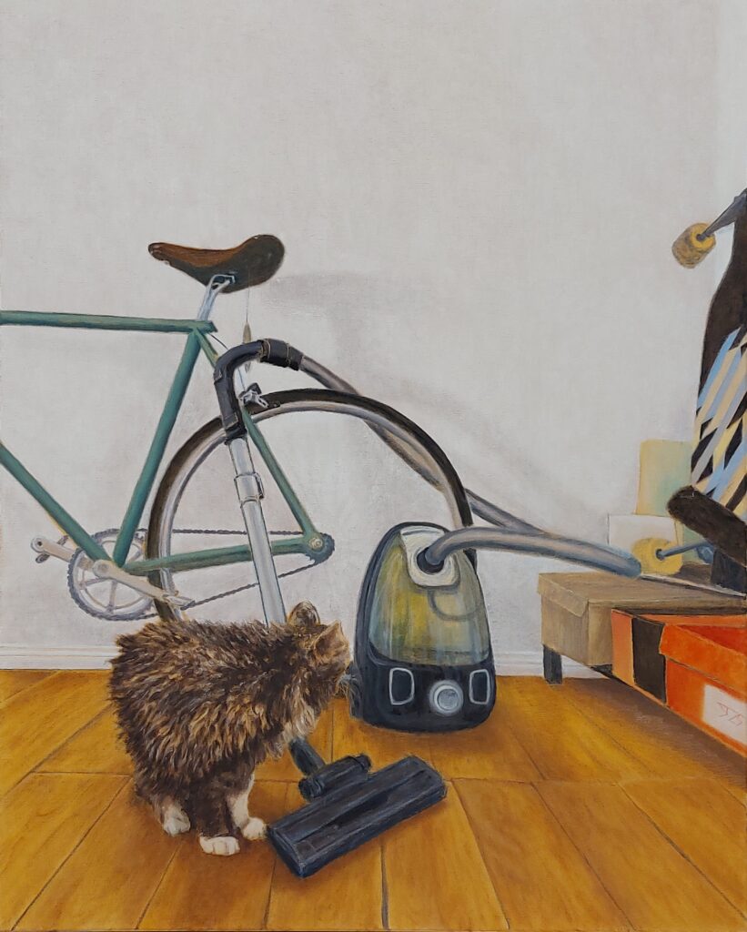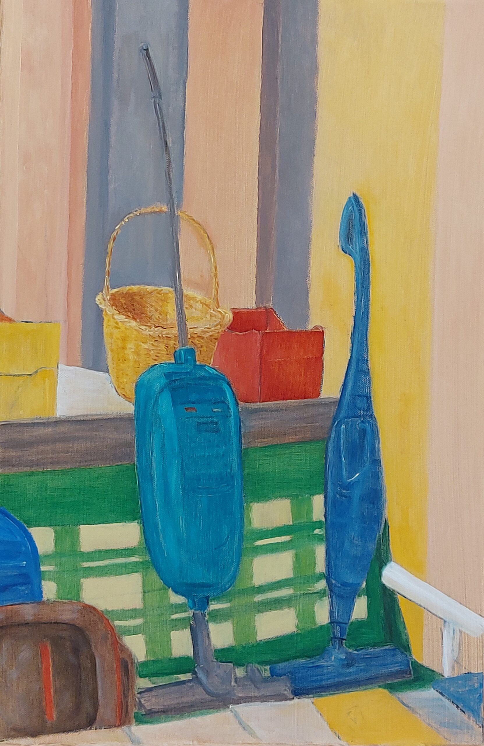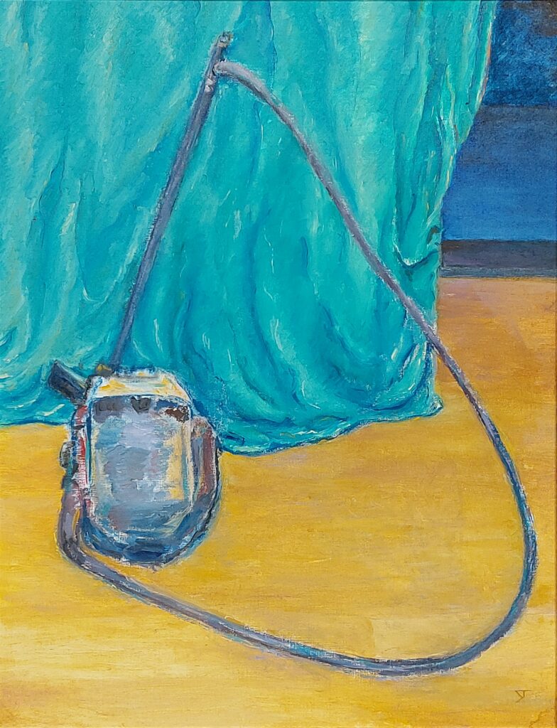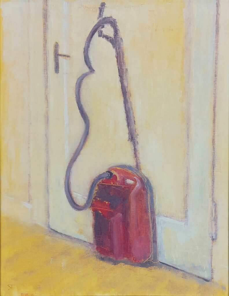 Start Gallery Colour Landscape Still Life Test cover……………….. Co Explore Still life of vauum cleaner in front of green curtain, oil on paper, 30 x 40 cm, 2025